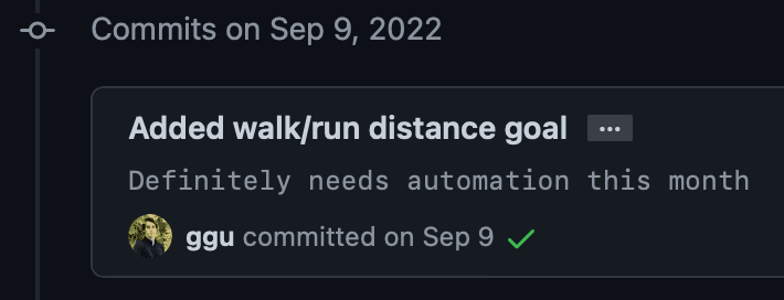 My intuition as a software developer told me that that these trackers should be automated - I really didn't want to have to manually update them every day. Hence, my first tracker was completely automated. It pulled all of my recent commits, filtered for the last seven days of commits, removed commits that were made to repositories that I don't own, and then tallied them up.