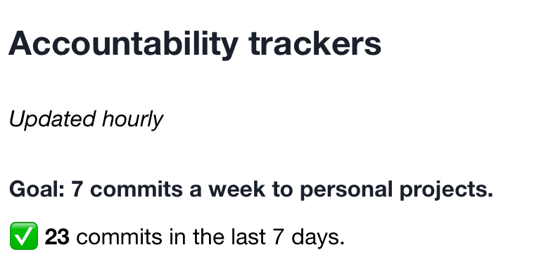 The initial idea for this feature just included tracking my commits to personal projects each week as a way to increase accountability, but since then, this feature has evolved into much more.
